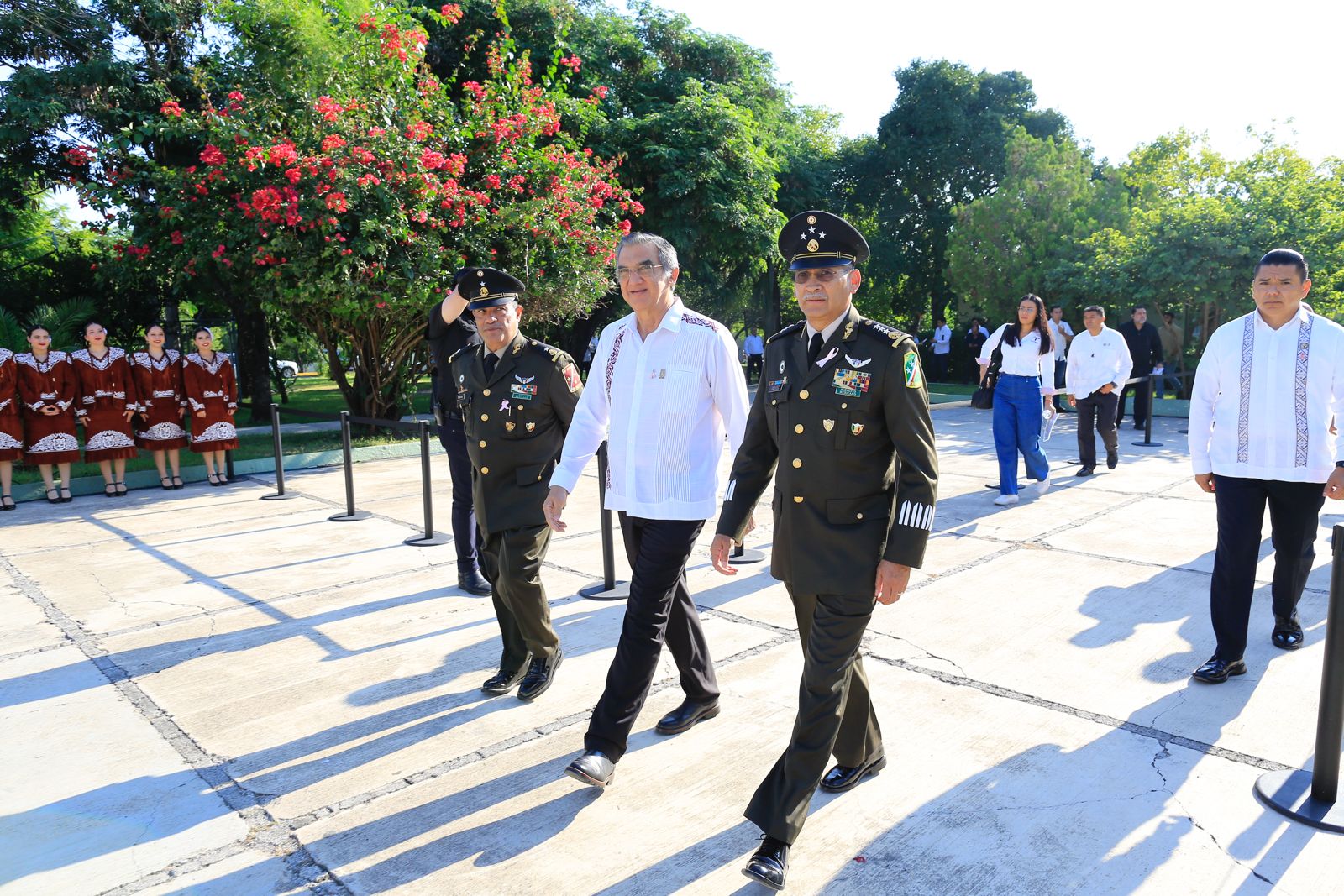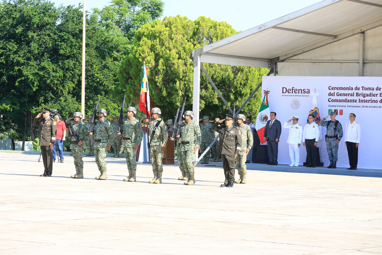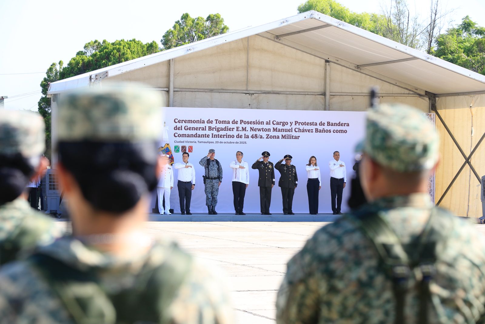 Ciudad Victoria, Tamaulipas (20 de octubre de 2025). – El gobernador Américo Villarreal Anaya asistió como invitado de honor a la toma de posesión al cargo y protesta de bandera del general brigadier de Estado Mayor, Newton Manuel Chávez Baños, como comandante interino de la 48 Zona Militar.