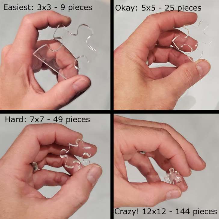 Pero no cuenta con solo una versión, sino que hay cuatro de ellas y suben de nivel, es decir, hay desde la más fácil a la más difícil. La opción más fácil consta de nueve piezas, el moderado tiene 25 piezas, el complicado tiene 49 y el «loco» (también conocido como imposible) tiene 144 pequeñas piezas de acrílico.