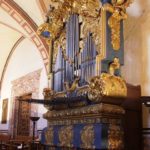 En su interior, sorprende el elaborado trabajo de los cinco retablos labrados en madera y totalmente cubiertos con una capa de oro genuino. El púlpito que muestra una rica ornamentación con incrustaciones de maderas preciosas, marfil, plata y carey. El coro bajo, donde se encuentran e! retablo ecléctico, el órgano del siglo XVIII y la capilla del Santísimo, dividido de la nave por un panel con quince medallones y una escultura de Jesucristo en la cruz. El coro alto, a su vez, lo divide un abanico dorado con la imagen de Jesús adolescente. En esta parte también se guarda un órgano Walcker, de principios de siglo.