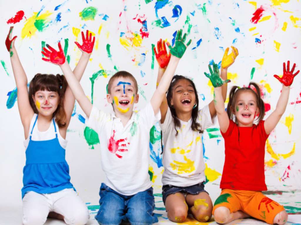 A group of cheerful kids with their palms and clothing painted