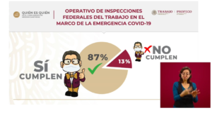 Derivado de los operativos de inspección federal realizados en los últimos días por la Secretaría del Trabajo y la Procuraduría Federal del Consumidor (Profeco), se detalló en la conferencia matutina de este lunes en Palacio Nacional que el 87 por ciento de las empresas cumplen con la normatividad, mientras que el 13 por ciento no lo hacen, de las cuales, afirmó Alcalde Luján, se les ha iniciado un procedimiento.