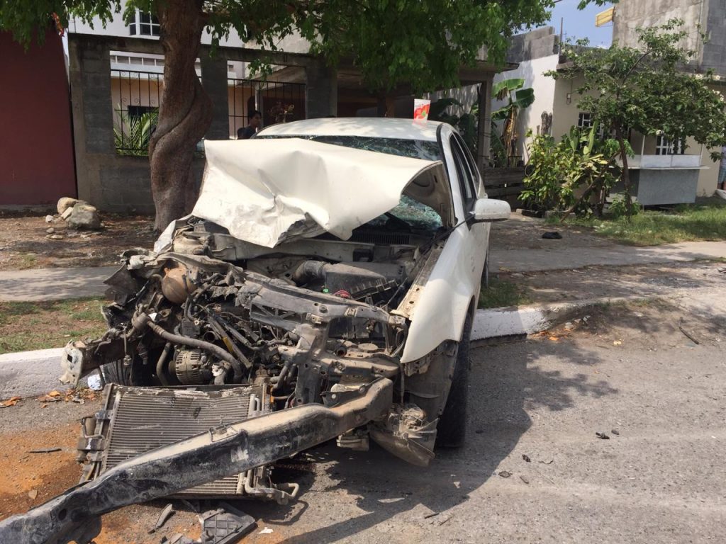 Después del impacto, el coche terminó sobre la banqueta y destrozado de la parte delantera.