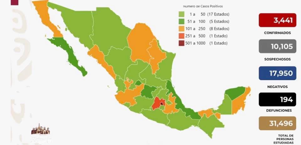 Cd. de México (09 abril 2020). La Secretaría de Salud federal reportó 20 nuevas muertes por Covid-19, con lo que suman 194; en el País hay 3 mil 441 casos confirmados, 260 más que ayer.
