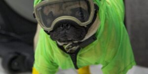 Cd. De México, 19 de mayo 2020.- Harley se abre paso por los corredores del centro médico junto a su dueña, la neuropsicóloga clínica Lucía Ledesma, quien le enfunda unos zapatos amarillos de caucho y un impermeable fluorescente de cremallera. Sin poner resistencia, Harley, está listo para juguetear durante dos horas con los médicos y enfermeras que atienden la pandemia, a quienes arranca sonrisas en medio de sus extenuantes jornadas.