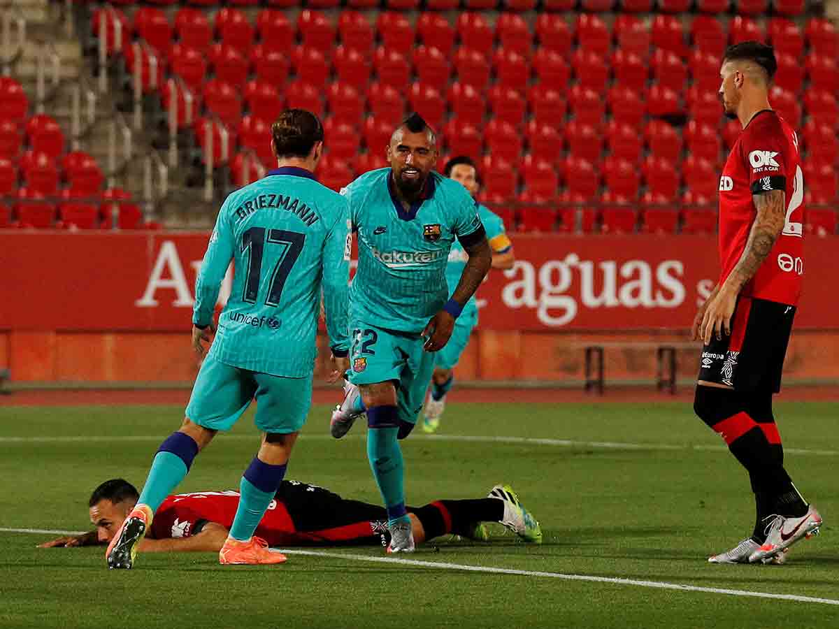 Barcelona, España, 13 de Junio de 2020..-.El Barcelona retomó la actividad con un contundente triunfo por 0-4 en su visita al Mallorca, correspondiente a la jornada 28 de la Liga de España, lo que le permite mantener el liderato gracias a las anotaciones de Arturo Vidal, Martin Braithwaite, Jordi Alba y Lionel Messi.