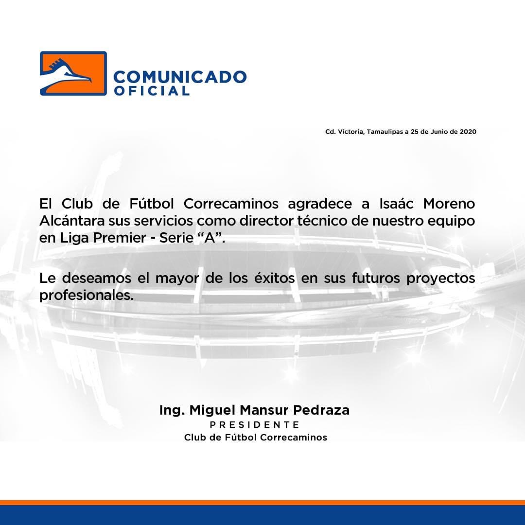 “El Club de Futbol Correcaminos agradece a Isaac Moreno Alcántara sus servicios como director técnico de nuestro equipo en la Liga Premier Serie A”, publicó.