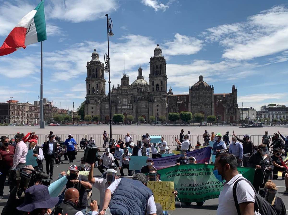 CIUDAD DE MÉXICO, 12 de Junio de 2020.- .De rodillas y frente al edificio de Gobierno de la Ciudad de México, 150 policías retirados y bomberos protestaron para que sea reabierta la caja de ahorro de esta institución.