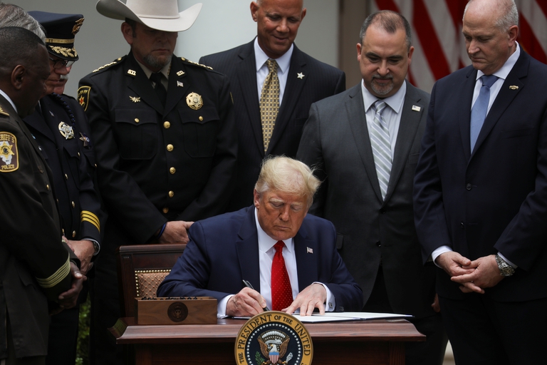 El presidente invitó a líderes de organizaciones de la policía para la firma de la orden ejecutiva, realizada en los jardines de la Casa Blanca. “Lo mínimo que podemos hacer, porque merecen mucho, es darles nuestra gratitud y respetarlos por lo que hacen”, elogió. Aunque había adelantado que también estarían invitados familiares de víctimas de intervenciones policiales, no estuvieron presentes y el mandatario explicó que se reunió con ellos antes de la ceremonia.