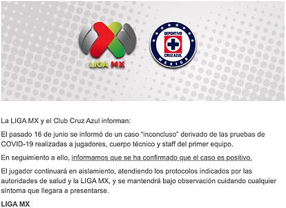 “El pasado 16 de junio se informó de un caso “inconcluso” derivado de las pruebas de Covid-19 realizadas a jugadores, cuerpo técnico y staff del primer equipo. En seguimiento a ello, informamos que se ha confirmado que el caso es positivo.
