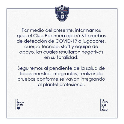 Pachuca, México, 19 de Junio 2020. El fútbol mexicano va tomando rumbo luego de la pandemia del Covid-19 en el país. Este jueves los Tuzos del Pachuca por medio de un comunicado, anunciaron que realizaron 61 pruebas de coronavirus en la institución y ninguno resultó afectado a causa de esta nueva enfermedad.