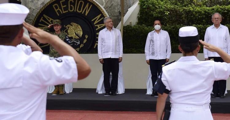 Isla Mujeres, Quintana Roo, 1 de Junio de 2020.- el presidente Andrés Manuel López Obrador encabezó un acto para conmemorar el 103 aniversario del Día de la Marina, en el que se distingue a los integrantes de la Secretaría de Marina (Semar) que están en primera línea ayudando a la población ante la pandemia del Covid-19, ya sea en atención hospitalaria o en el Plan DN-III.