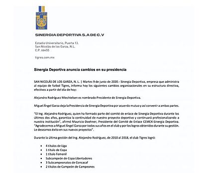 Monterrey, México, 10 de Junio 2020. Comienzan grandes cambios en Tigres de cara al Apertura 2020. El primero y sorpresivo, es que Miguel Ángel Garza deja su presidencia. A través de un comunicado en redes sociales, el cuadro felino informó este martes que el l Ing. Alejandro Rodríguez Miechielsen tomará su lugar.