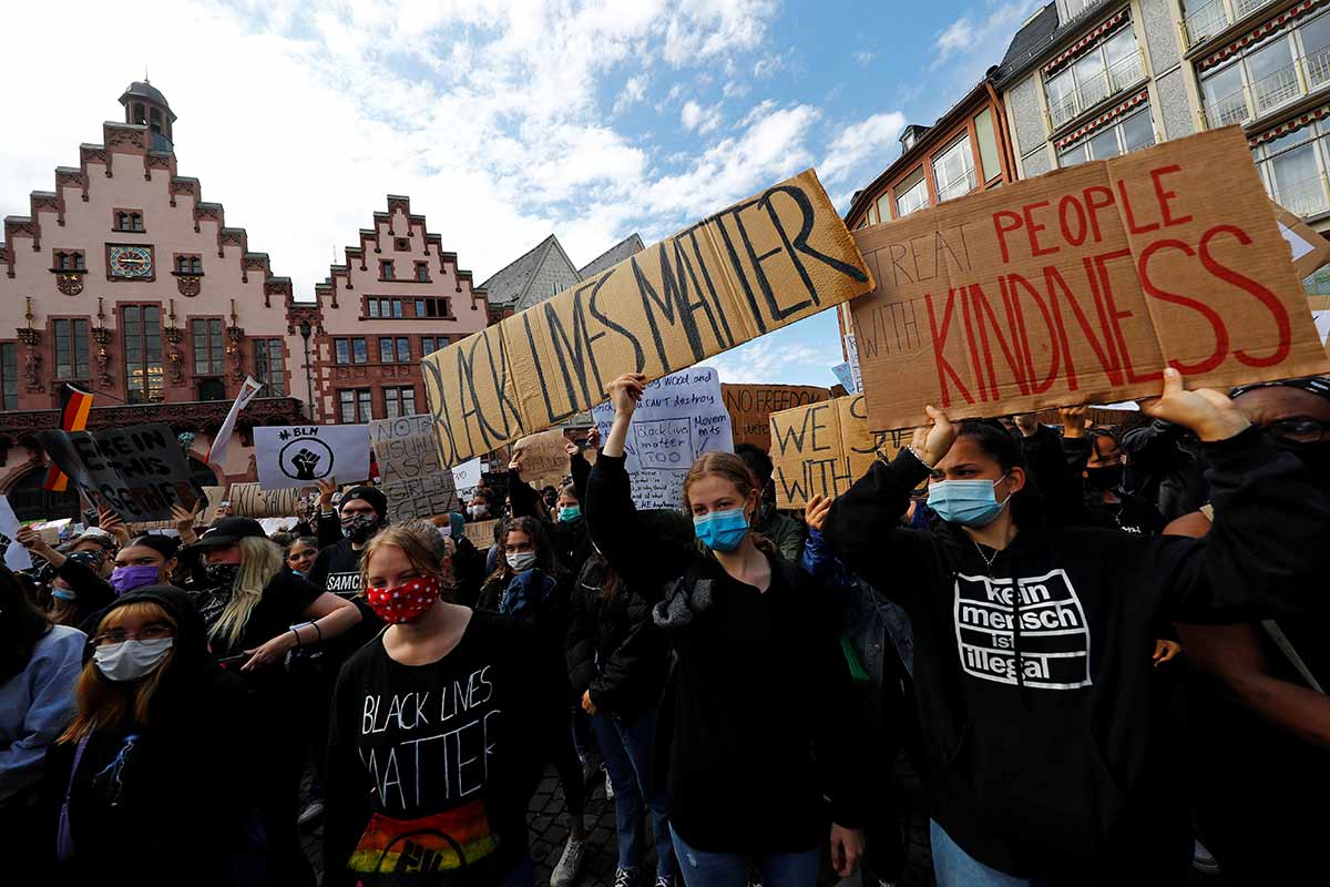 LONDRES. 06 junio 2020. Con la frase “No puedo respirar” como lema, pronunciada por George Floyd antes de morir a manos de la policía en Estados Unidos, miles de personas en todo el mundo desafían hoy a la pandemia del coronavirus para manifestarse contra las desigualdades sociales y la brutalidad policial.