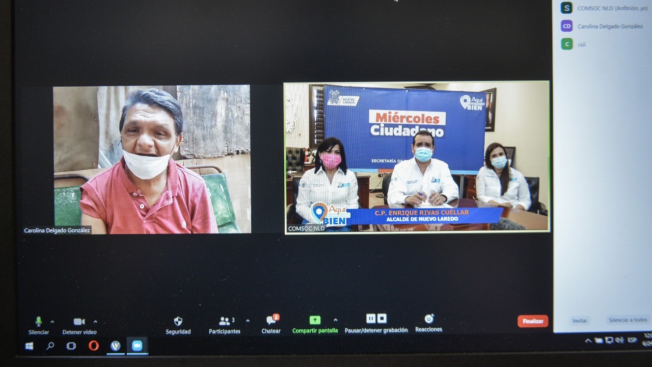 Nuevo Laredo, Tamaulipas, 24 de Junio de 2020.- En una edición más de ‘Miércoles Ciudadano’ en formato virtual, el presidente municipal Enrique Rivas atendió las peticiones de vecinos de 5 colonias del poniente de la ciudad, quienes le solicitaron limpieza de arroyos y canales, servicios de ‘Médico en tu Puerta’ y el arreglo de un parque.