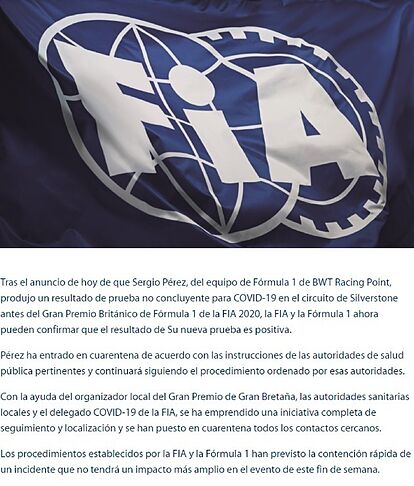 “Tras el anuncio de hoy de que Sergio Pérez, del equipo de Fórmula 1 de BWT Racing Point, produjo un resultado de prueba no concluyente de COVID-19 en el circuito de Silverstone, antes del Gran Premio Británico de Fórmula 1 de la FIA 2020, la FIA y la Fórmula 1 ahora pueden confirmar que el resultado de su nueva prueba es positiva. Pérez ha entrado en cuarentena de acuerdo con las instrucciones de las autoridades de salud pública pertinentes y continuará siguiendo el procedimiento ordenado por esas autoridades”.