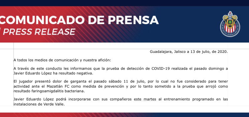 “A través de este conducto les informamos que la prueba de detección de Covid-19 realizada el pasado domingo a Javier Eduardo López ha resultado negativa”.