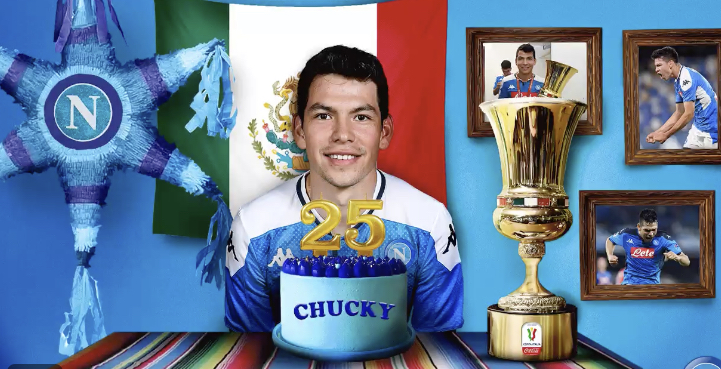 Italia, 30 de Julio 2020. Hirving ‘Chucky’ Lozano está de fiesta. El atacante cumple este 30 de julio 25 años de edad y el Napoli, su actual club, decidió festejarlo con un estilo muy mexicano en sus redes sociales, en donde le deseó lo mejor al canterano de Pachuca con una imagen en donde la bandera azteca no faltó, así como otros detalles nacionales además de la Copa de Italia, el título que recientemente conquistó el cuadro napolitano y que se sumó al palmarés de Lozano.