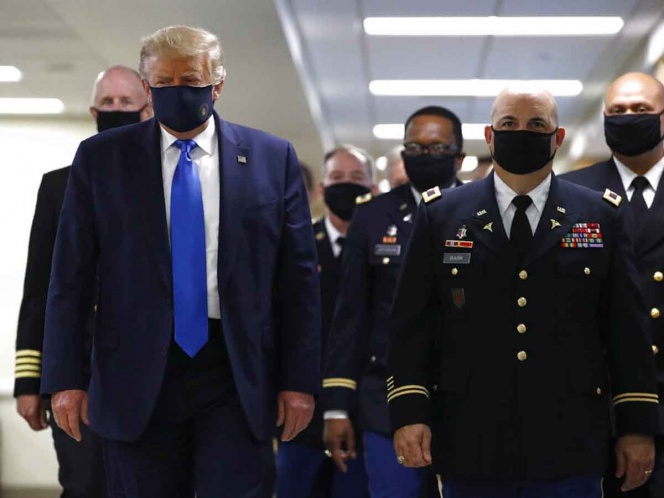 Trump viajó en helicóptero al Centro Médico Militar Nacional Walter Reed en un suburbio de Washington para visitar a militares heridos y personal de salud que atiende a pacientes de COVID-19. A su salida a la Casa Blanca, el presidente dijo a los reporteros que “cuando uno se encuentra en un hospital, especialmente… creo que se espera que se use una mascarilla”.