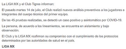 Monterrey, México m, 18 de Julio 2020. El conjunto de los Tigres de la UANL, por medio de un comunicado en conjunto con la Liga MX, dio a conocer que, de 45 pruebas para la detección del Covid-19 aplicadas al primer equipo, una resultó ser positiva.