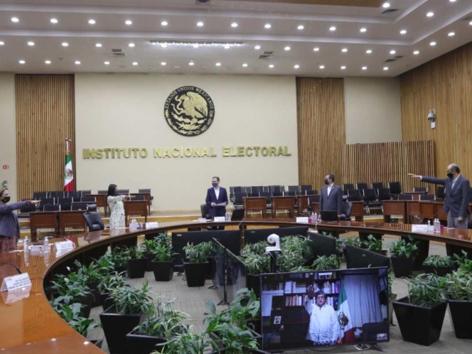 Norma Irene de la Cruz, Carla Humphrey Jordan, José Martín Faz, Lorenzo Córdova y Edmundo Jacobo, asistieron presencialmente al salón de sesiones, mientras de forma remota el consejero Uuc Kib tomó protesta.
