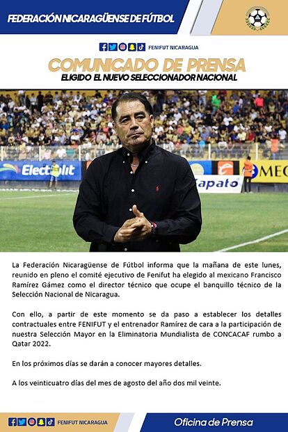 “A partir de este momento se da paso a establecer los detalles contractuales entre FENIFUT y el entrenador Ramírez de cara a la participación de nuestra Selección Mayor en la Eliminatoria Mundialista de Concacaf rumbo a Qatar 2022″, escribió en un comunicado el representativo centroamericano.