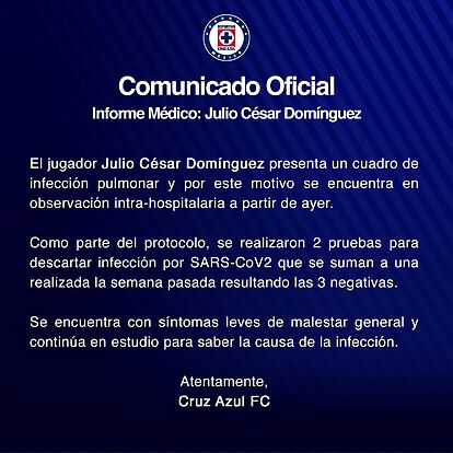 CDMX, México, 05 de Agosto 2020. Mediante un comunicado, Cruz Azul informó a través de sus redes sociales que Julio César Domínguez se encuentra bajo observación intrahospitalaria tras presentar un cuadro de infección pulmonar desde el día de ayer.