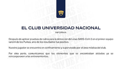 En el anuncio explica que de todas las pruebas realizadas solamente un miembro del plantel salió contagiado, mismo que se encuentra aislado y resultó ser asintomático.