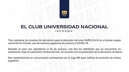 Pumas se reservó el derecho a dar a conocer el nombre del jugador y tras el resultado positivo dado a conocer previo a la jornada 3, ya son dos los jugadores que no podrán ver acción en las siguientes jornadas ante Rayados, Mazatlán y Tigres.