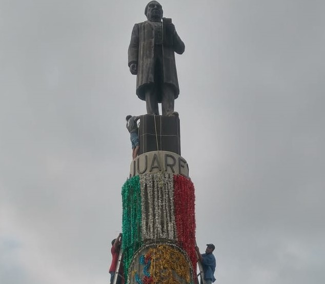 Jorge Alberto Castillo Ruiz, encargado de dicha dirección, dijo que esta semana se inició con la colocación en el Monumento a Benito Juárez del adorno cilíndrico con los colores de la bandera nacional y el escudo al centro por lado norte y sur.