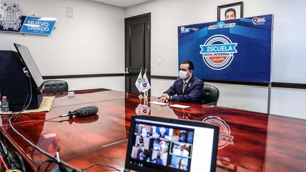 Nuevo Laredo, Tamaulipas, 13 de Oct. de 2020.- El programa ‘Mi Escuela Digna, Moderna y Saludable’ llegó a los 198 espacios educativos beneficiados en esta segunda vuelta, el presidente municipal Enrique Rivas Cuéllar mediante plataforma Zoom, informó a la directora del Jardín de Niños ‘Federico Froebel’, los beneficios a su plantel.