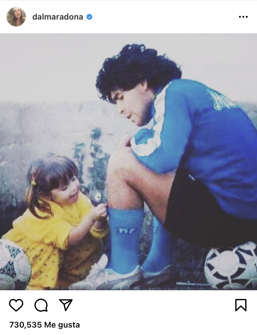 Argentina, 27 de Noviembre 2020. Dalma Maradona, la hija mayor de Diego Armando Maradona, escribió un emotivo mensaje en su cuenta de Instagram, acompañado de una foto en la que se ve al Diez en un entrenamiento en su etapa en el Napoli junto a su hija jugando con sus medias. Este es el mensaje completo de Dalma:
