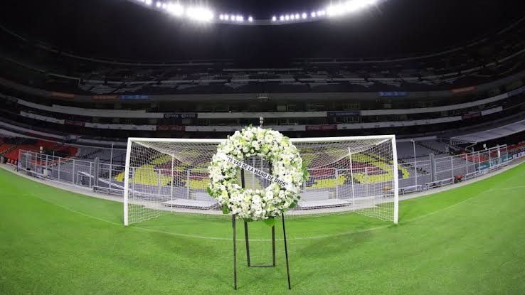 CDMX, México, 26 de Noviembre 2020. La muerte de Diego Armando Maradona sigue generando respuestas de admiración y luto alrededor del mundo, y la cancha del Estadio Azteca fue la sede de unos de los homenajes más emotivos, ya que la administración del inmueble colocó una corona de flores en honor al ‘Diez’ en una de las porterías, precisamente en aquella en la que el argentino firmó el llamado Gol del Siglo en el Mundial de México 86.