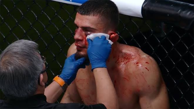 Las Vegas, Estados Unidos, 08 de Noviembre 2020. Terrible la forma la que definió el combate entre Ramiz Brahimaj y Max Griffin dentro de las peleas preliminares de la UFC Vegas 13,. El triunfo fue para Griffin, por nocaut técnico, debido a que Brahimaj…¡se le desprendió parte de la oreja izquierda!