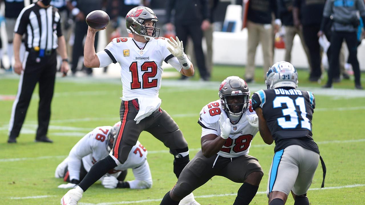 Estados Unidos, 16 de Noviembre 2020. El quarterback Tom Brady lanzó para 341 yardas y estuvo involucrado en cuatro jugadas de touchdown; Ronald Jones impuso un récord de franquicia con un touchdown en acarreo de 98 yardas y los Buccaneers de Tampa Bay se recuperaron el domingo de una terrible derrota con un contundente triunfo de 46-23 sobre los Panthers de Carolina.