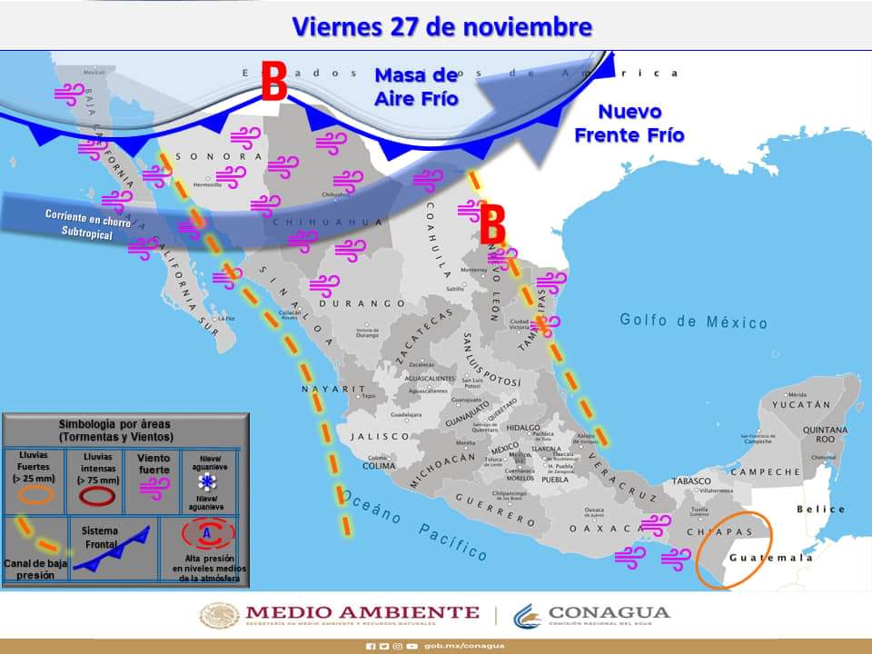 Para el próximo viernes estará ingresando el frente frío 17 de la temporada con la posibilidad para que los días viernes y sábado se presenten lluvias moderadas, así mismo viene acompañado de una masa de aire frío que puede provocar que el termómetro descienda hasta los 4°c en la mínima el lunes próximo, por lo que se recomienda a la ciudadanía a extremar precauciones, cuidar y abrigar bien a los infantes y a los adultos mayores, resguardarse de este clima frío y húmedo que es el más riesgoso para contraer enfermedades respiratorias.