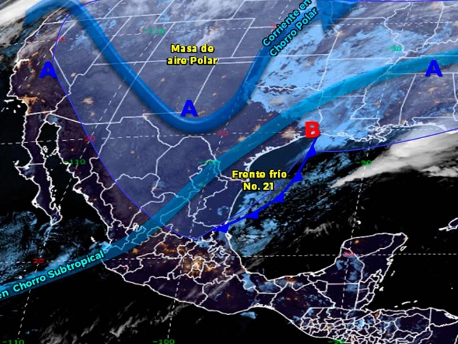 CIUDAD DE MÉXICO, 16 DE DIC. DE 2020.- El Frente Frío número 21 recorrerá este miércoles el oriente y sur de México, y gradualmente la Península de Yucatán.