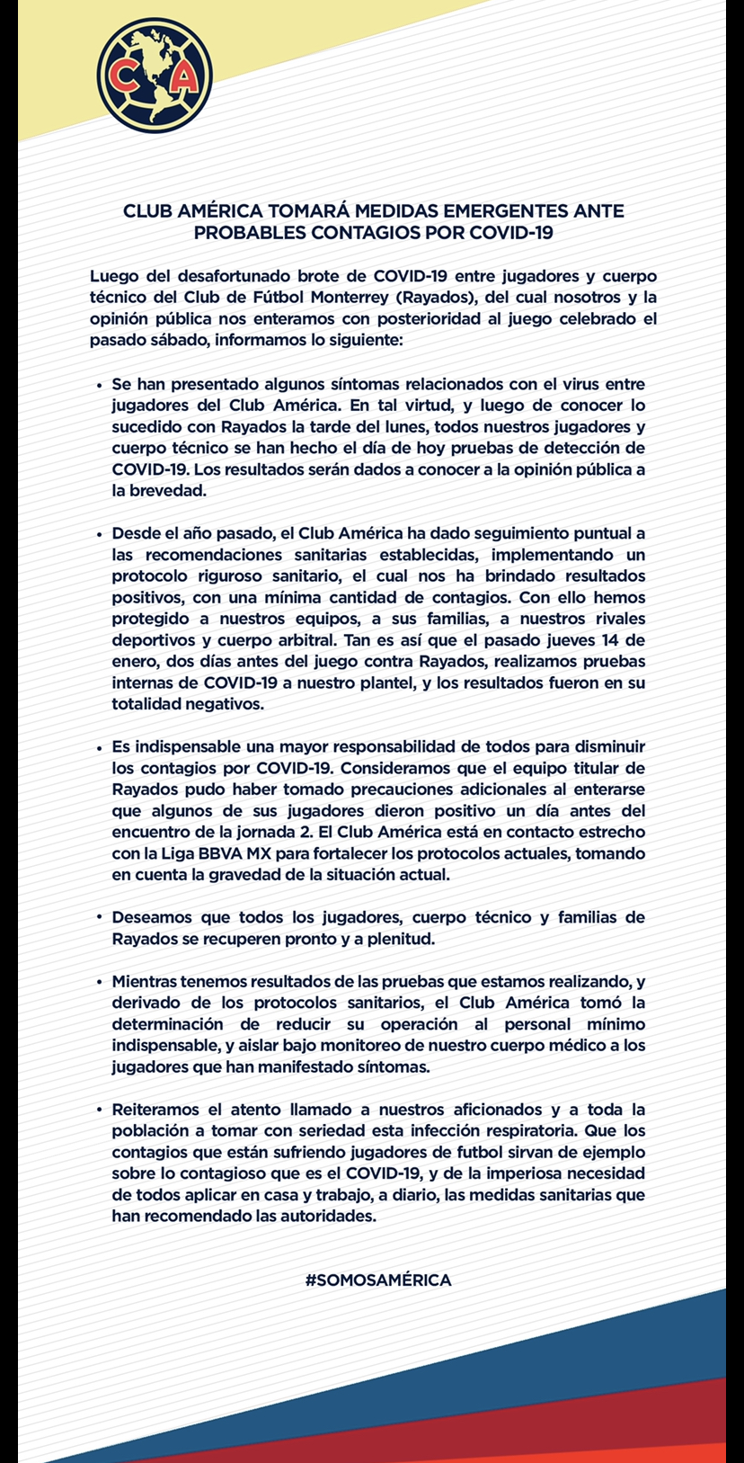 “Es indispensable una mayor responsabilidad de todos para disminuir los contagios por Covid-19. Consideramos que el equipo titular de Rayados pudo haber tomado precauciones adicionales al enterarse que algunos de sus jugadores dieron positivo un día antes del encuentro de la jornada 2. El Club América está en contacto estrecho con la Liga MX para fortalecer los protocolos actuales, tomando en cuenta la gravedad de la situación actual”.