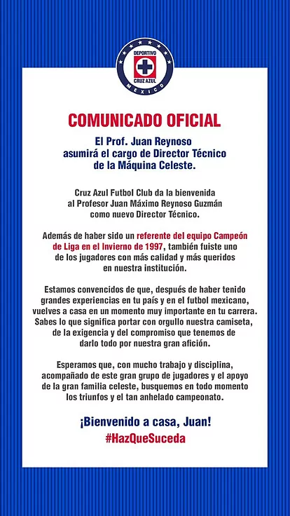 “Le damos la bienvenida al profesor Juan Reynoso”, escribió La Máquina en sus redes sociales, donde publicó un comunicado en el que recordó el éxito del sudamericano cuando militó como futbolista en el conjunto cementero.