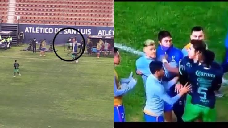 México, 19 de Febrero 2021. En un video se aprecia a Félix Torres empujando a un recogebalones que no le quiere dar el esférico, lo que desató la bronca. También se aprecia a Félix dando un golpe en el rostro a Germán Berterame, del San Luis.