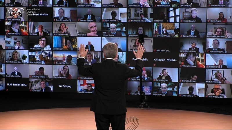 Por culpa de la pandemia, Bach se pronunció frente a una muralla de pantallas de miembros conectados online, en vez de la asamblea que se había previsto para junio en Atenas.