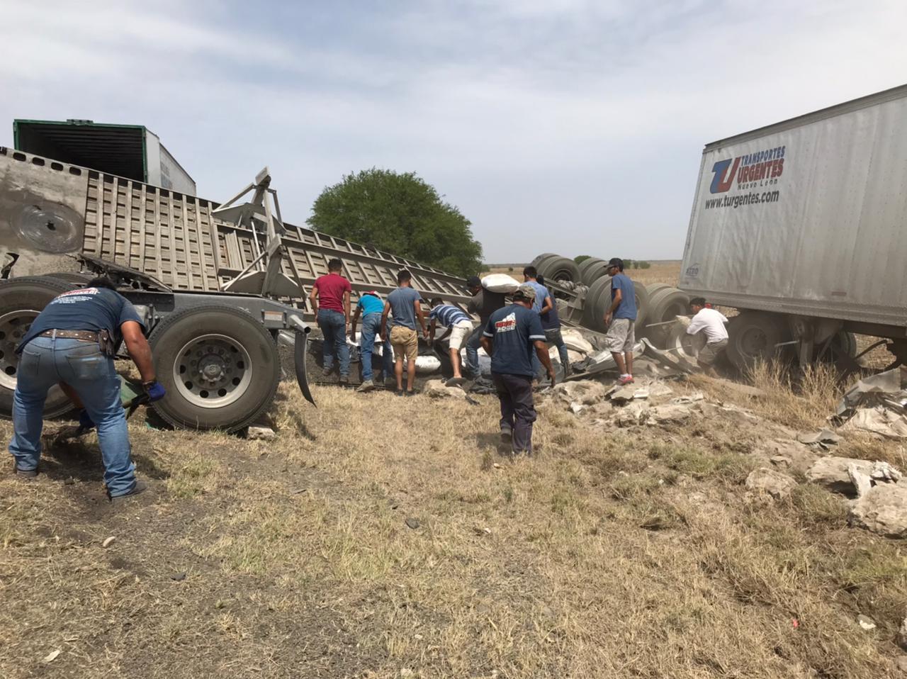 Vuelca tráiler cargado con azúcar en la carretera Victoria-Tampico