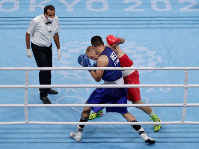 TOKIO, JAPON, 28 DE JULIO DE 2021.- El mexicano Rogelio Romero venció por decisión dividida al croata Luka Plantic y avanza a los cuartos de final del boxeo olímpico en la división de los semipesados