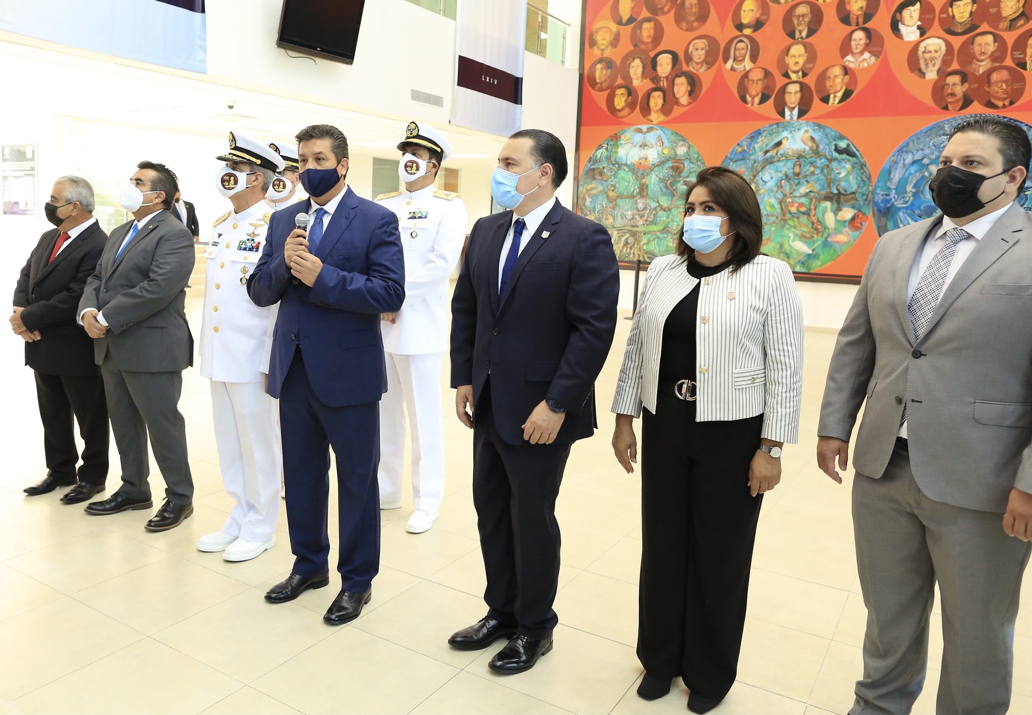 Posteriormente, tras develar la placa conmemorativa por el bicentenario de la Secretaría de Marina Armada de México en el Congreso del Estado, acompañado por el presidente de la Junta de Coordinación Política del Congreso del Estado Gerardo Peña Flores y el magistrado presidente del Supremo Tribunal de Justicia, Horacio Ortiz Renán el Ejecutivo estatal enfatizó: “aquí frente a ustedes quiero hacer un amplio reconocimiento al trabajo que ha venido desempeñando la Marina Armada de México en territorio tamaulipeco”.