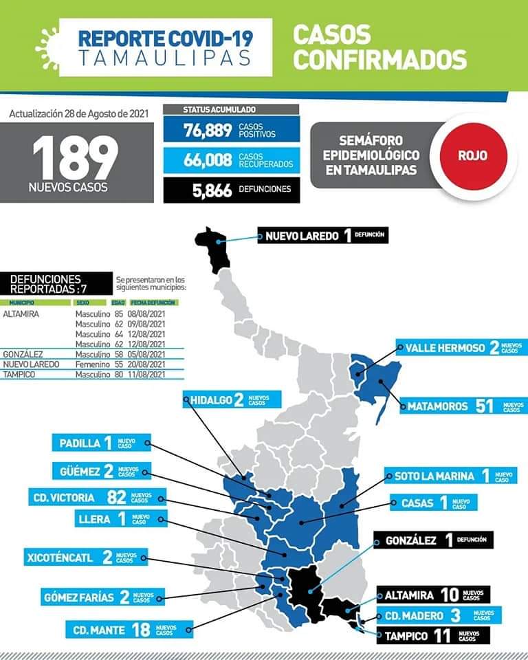 Ciudad Victoria, Tamaulipas (28 de agosto de 2021).- Tamaulipas registró hoy 189 nuevos casos de covid-19 y 7 defunciones por complicaciones graves, informó desde esta ciudad capital la secretaria de Salud, Gloria Molina Gamboa quien advirtió que la pandemia seguirá activa hasta que se avance en la cobertura de vacunación y que la población atienda de manera uniforme las medidas universales de uso del cubrebocas, el lavado frecuente de manos y la sana distancia.
