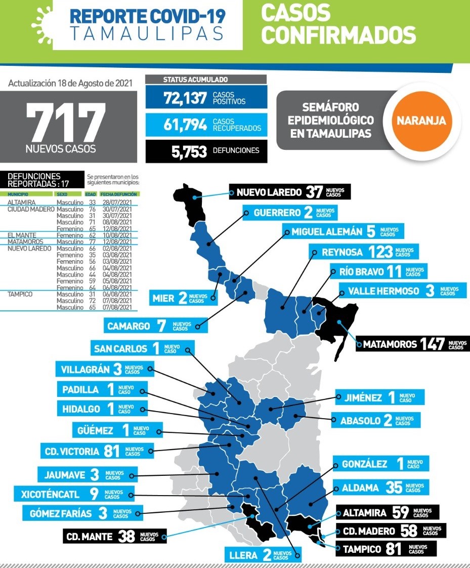 CD. VICTORIA, TAMAULPAS, 18 DE AGOSTO DE 2021. – Tamaulipas llegó hoy al pico más alto de la pandemia de COVID-19 al confirmar 717 nuevos casos y 17 fallecimientos por complicaciones graves, informó la secretaria de Salud, Gloria Molina Gamboa quien urgió a la población a vacunarse, quedarse en casa el mayor tiempo posible y reforzar las medidas preventivas para mitigar el impacto de la tercera ola de contagios.