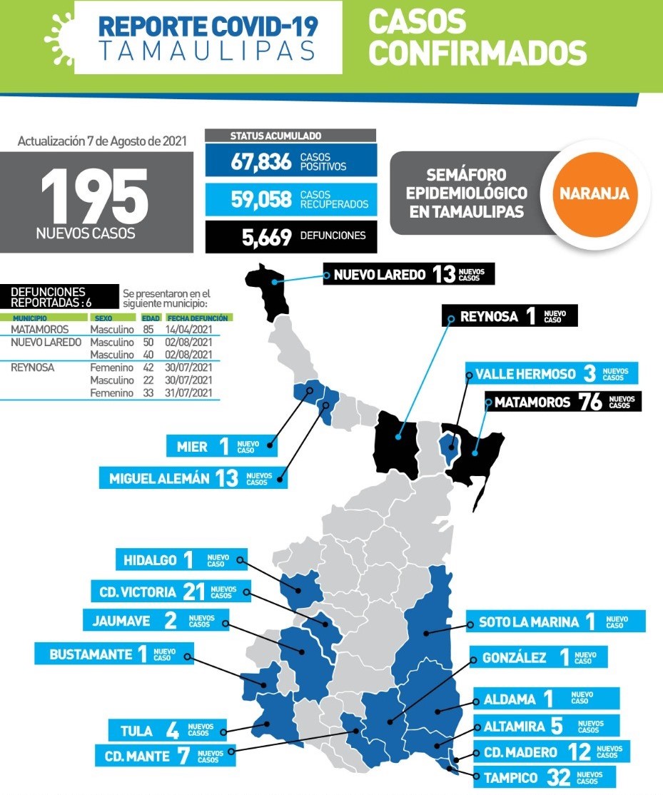 CD. VICTORIA, TAMAULIPAS, 7 DE AGOSTO DE 2021.- En la cresta de la tercera ola de COVID-19 que afecta a Tamaulipas, hoy se reportaron por autoridades sanitarias 195 nuevos contagios  en 18 municipios, así como 6 muertes más.