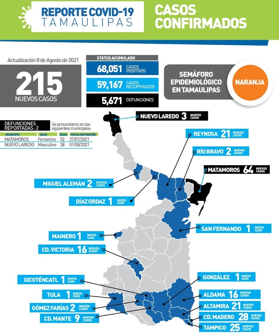 De los dos decesos se trata de un varón de 38 años en Nuevo Laredo y una mujer de 52 años en Matamoros.