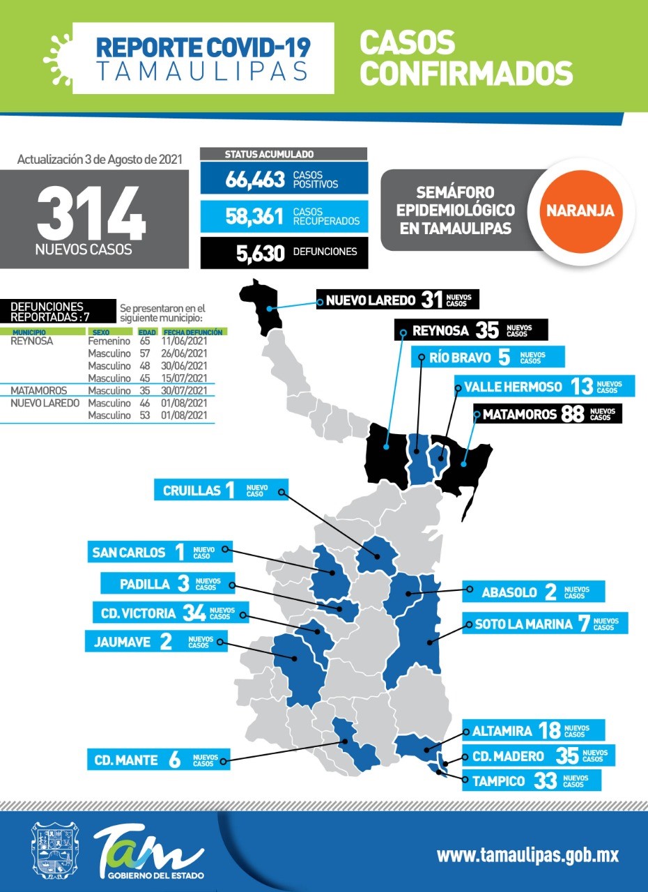 CD. VICTORIA, TAMAULIPAS, 3 DE AGOSTO DE 2021.- En su reporte COVID-19 de este martes, la secretaria de Salud de Tamaulipas, Gloria Molina Gamboa confirmó 314 nuevos casos y 7 fallecimientos asociados a complicaciones graves por la enfermedad.