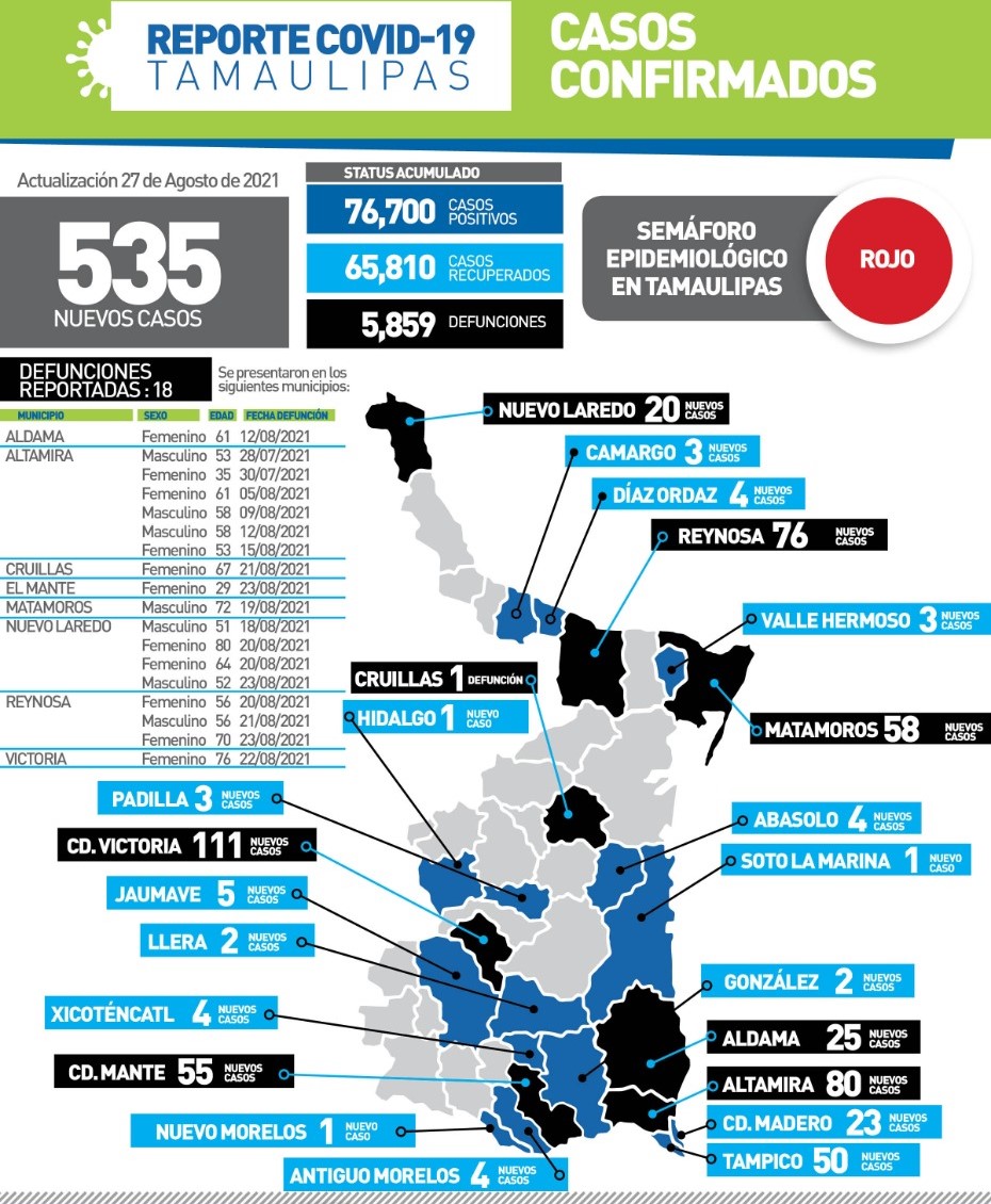 CD. VICTORIA, TAMAULIPAS, 27 DE AGOSTO DE 2021.- Al señalar que el riesgo de contagio, hospitalizaciones y fallecimientos por covid-19 sigue siendo elevado, la secretaria de Salud de Tamaulipas, Gloria Molina Gamboa aseguró que sólo podrá enfrentarse la pandemia hasta que toda la sociedad aplique las medidas de seguridad sanitaria como un hábito en las actividades cotidianas. Este viernes se registraron 535 casos positivos y 18 defunciones.