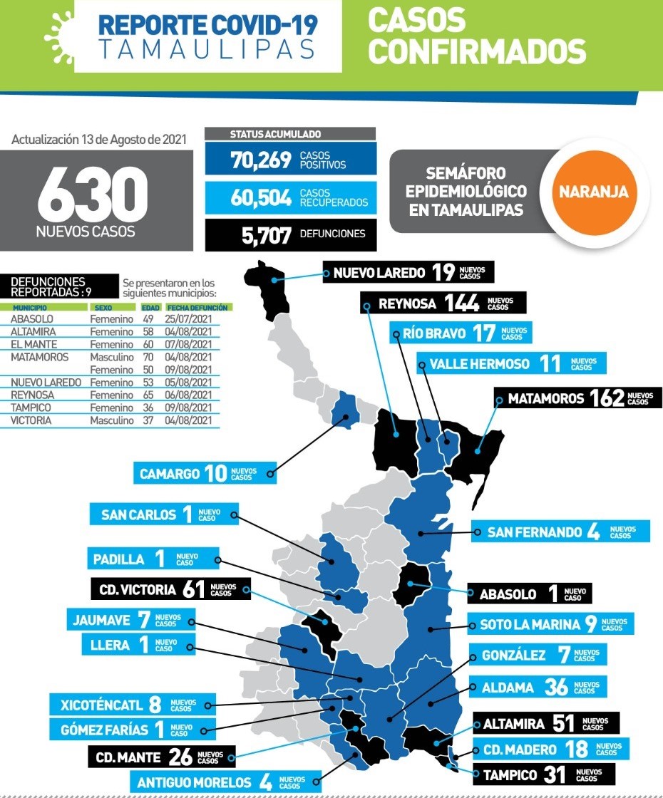 CD. VICTORIA, TAMAULIPAS, 13 DE AGOSTO DE 2021.-Tamaulipas registró este viernes el máximo rebote de contagios de COVID-19 al reportarse por autoridades sanitarias 630 casos y 9 muertes más,  lo que eleva a 70 mil 269 casos positivos, de  los cuales 60 mil 504 se recuperaron y murieron 5 mil 707.
